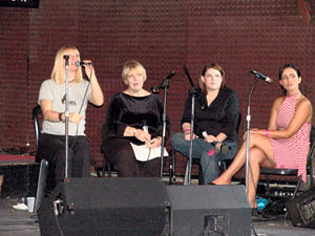 Courtesy of Stephanie Crock "Stage Performance & Showcasing" Panel 03.30.03 L to R: Chris Kline (on screen), Chalene Noakes, AJ Vallejo & Nikki Rowling |