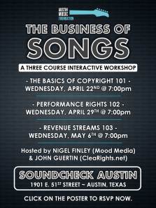 This was the first of a three course workshop that will continue to build knowledge on the business of music throughout the next two workshops. Austin Music Foundation thanks Nigel Finley and John Guertin for hosting and putting together the content provided in these workshops. We hope to see you at the next meeting! If you have any questions feel free to email [email protected].