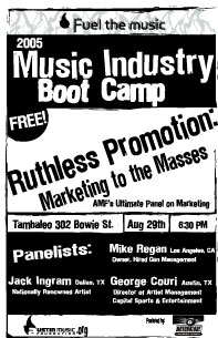 August�s Music Industry Boot Camp, �Ruthless Promotion: Marketing to the Masses,� was a complete success. The packed room at Tambaleo was treated to an entertaining and insightful panel made up of local experts, as well as one of our Advisory Board members from Los Angeles who joined us. Our interns put countless hours into the ultimate "No Excuses" marketing handbook. We would like to thank everyone for coming, especially our busy panelists. Don�t miss the next Boot Camp on October 24th "The Soundtrack of YOUR lives: Licensing Music for Video Games, Commercials, Film & TV."
